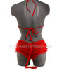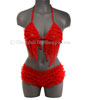 All eyes will be on you! Fire red devil costume with ruffles on the halter bra top also has matching ruffled booty shorts that have a removable tail Also included are horns to add the finishing touch on this ultra hot costume.